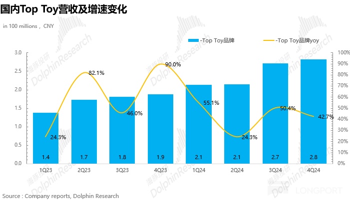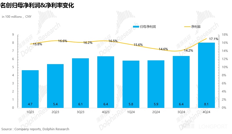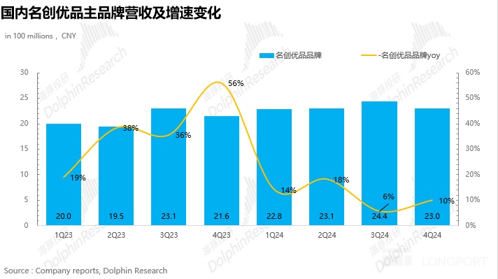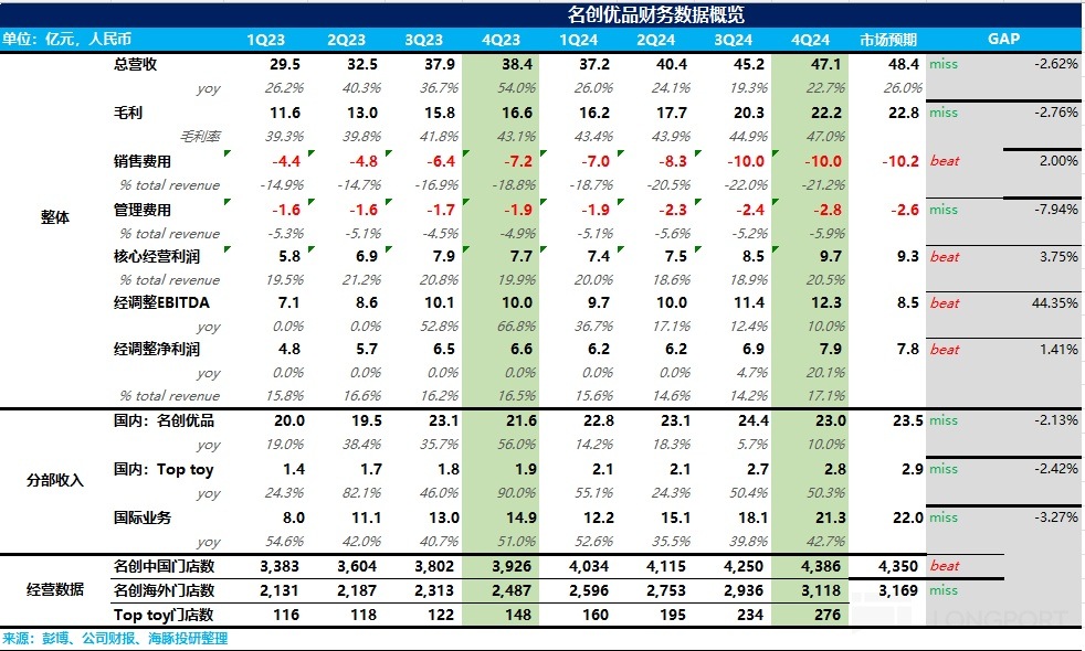 1、海外營收如期高增:24Q4 公司實現營收 47.1 億元,同比增長達到 22.7%,小幅 miss 了彭博一致預期(48.1 億元)。核心驅動在於海外市場同比高增 42.7%,其中直營和代理市場分別同比增長 65.5% 和 17.4%,以北美地區為代表的直營市場高速增長,海外營收佔比進一步提升至 45%(去年同期僅為 39%)。國内實現營收 25.8 億元,相較於 Q3 增速環比修復,其中名創優品品牌增長 10%,TOPTOY 延續 42.7% 的高增長。