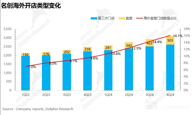 從海外新增門店的結構上看,海外直營門店增速更高(以北美地區為主),佔比進一步提升至 16.1%(從 23Q1 開始海外直營門店佔比連續環比提升)