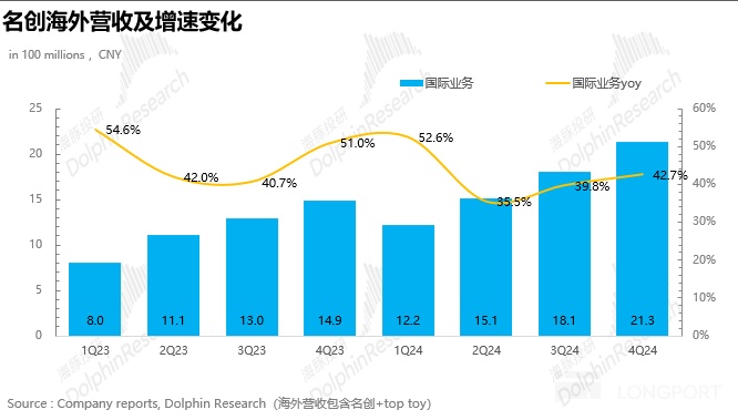 在國内增長放緩,名創把 「第二增長曲綫」 押注海外,因此海外業務的增長是投資者最關心的,名創在 2024 年投資者交流會上放出 「豪言」:未來 5 年海外整體營收要翻四倍,對應 CAGR30%-40% 左右,因此從這個角度海豚君認為海外 42.7% 的增速可以算勉強達標。