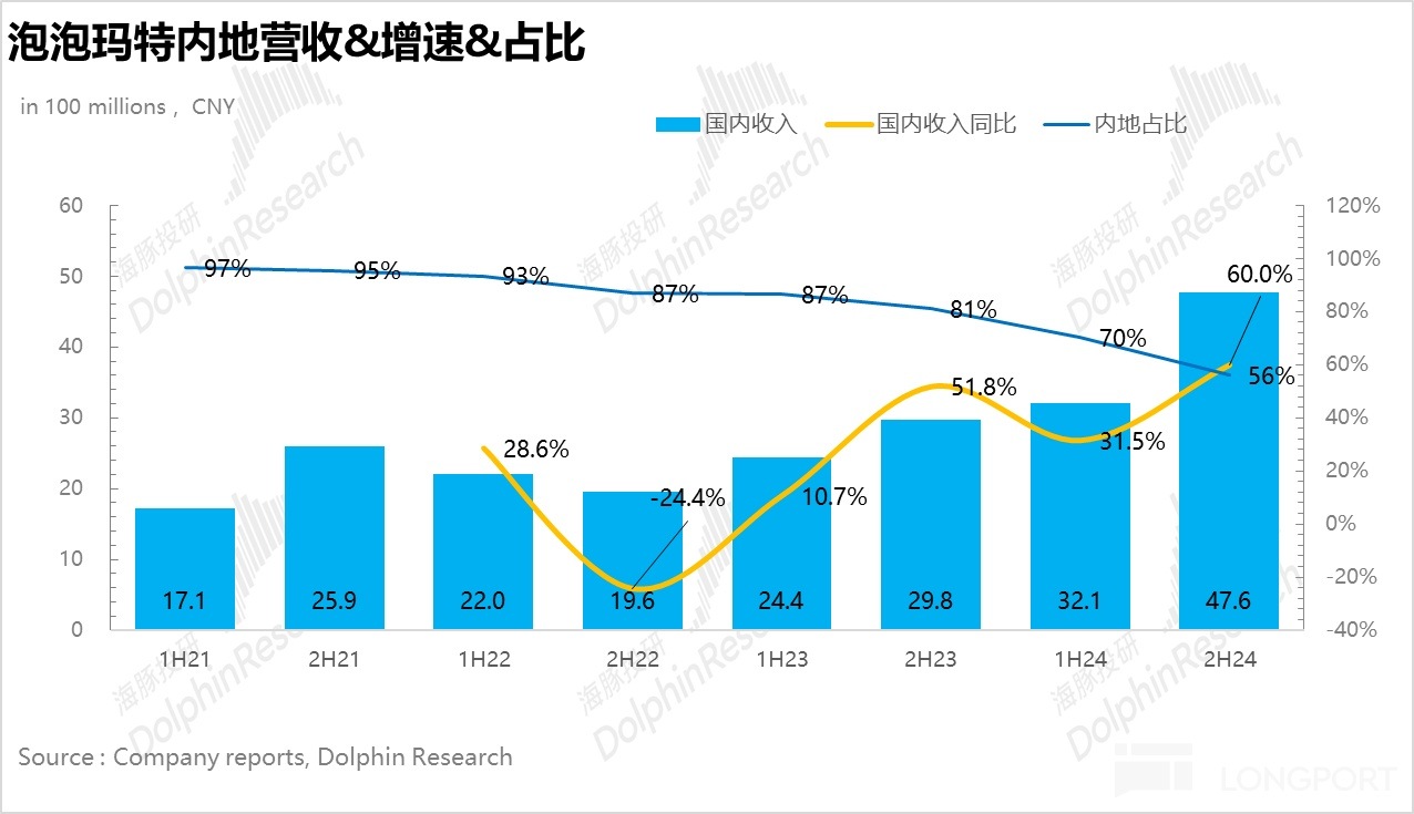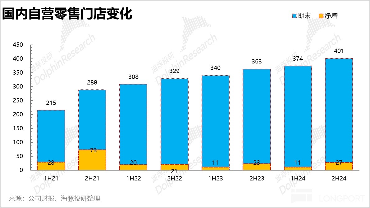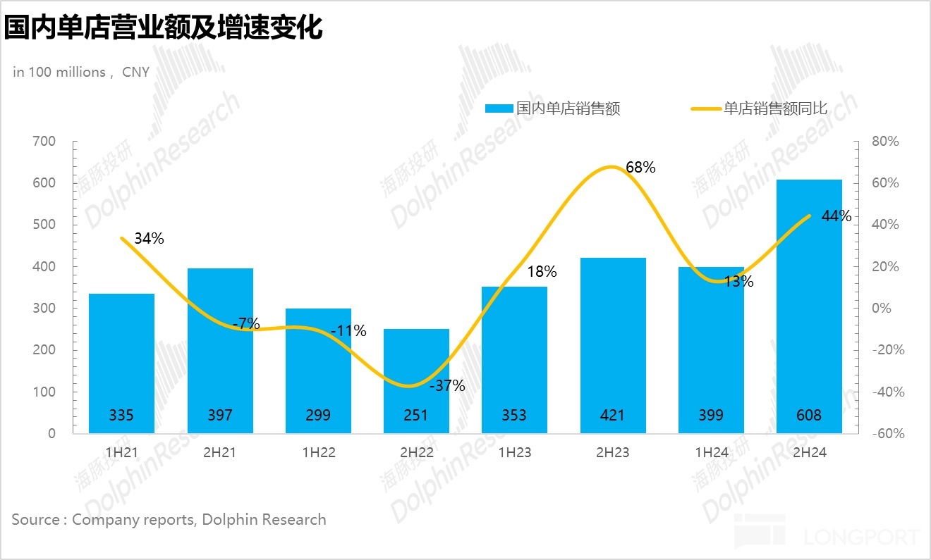 國内下半年整體營收 41.8 億元,同比增長 60%,相較於上半年環比提速。其中綫下零售店實現營收 23.6 億元,同比增長 60%,由於市場普遍按照 Q3 的增速(Q3 綫下零售僅同比增長 30%-35%)預測 Q4,因此綫下零售大幅超出市場預期。
