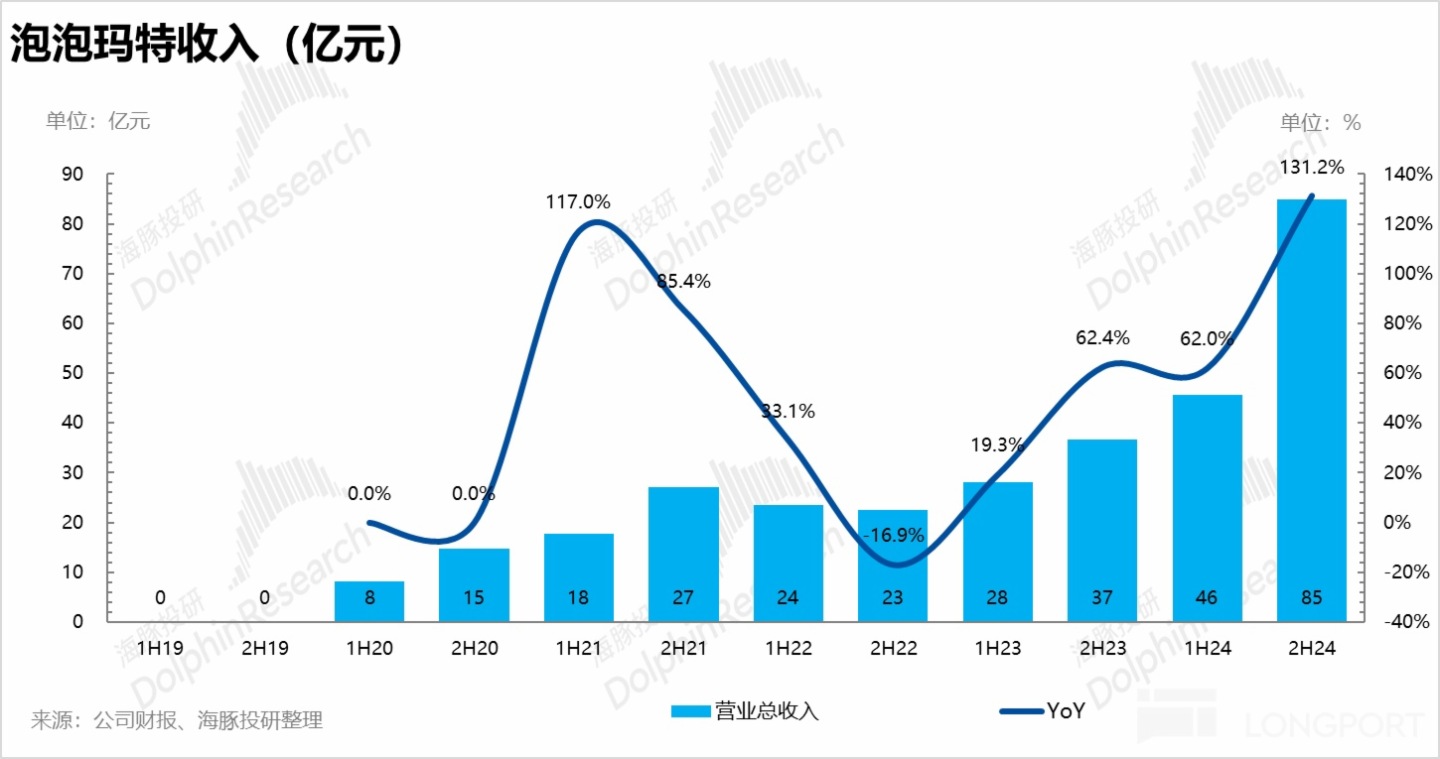 下半年公司實現總營收 84.8 億元,同比增長達到 131.2%,超出市場預期(76.7 億元),和公司此前披露的 Q3 同比增長 120%-125% 的業績相比 Q4 環比提速,泡泡瑪特的 「造神運動」 仍在繼續。
