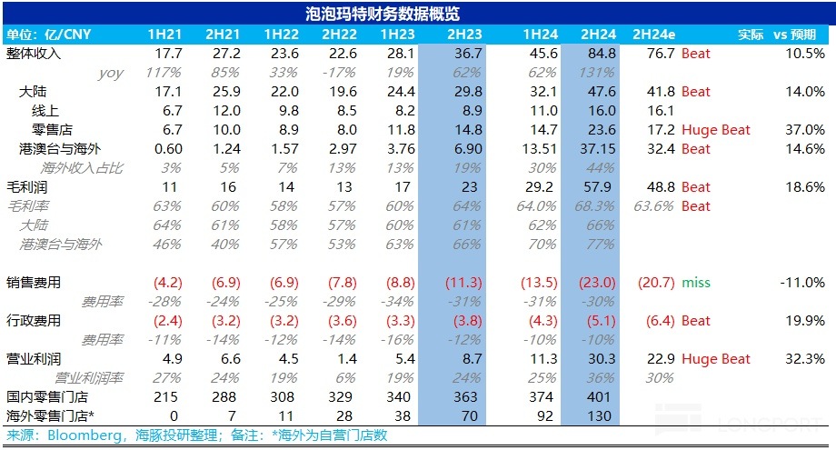 北京時間 3 月 26 日下午,泡泡瑪特(9992.HK)發佈了 2024 年 H2 業績,整體上業績還是非常不錯的,海外延續了 Q3 高增的勢頭持續狂飙,國内綫下門店更是環比 Q3 提速,毛利率由於産品結構提升疊加高毛利海外業務佔比增加,創下歷史新高,費用投放上也比較克制,最終利潤上也超出市場預期。