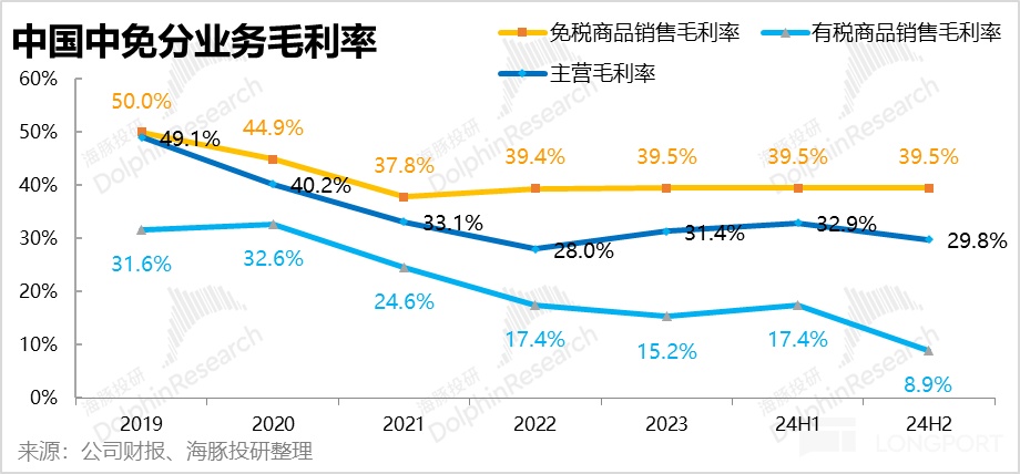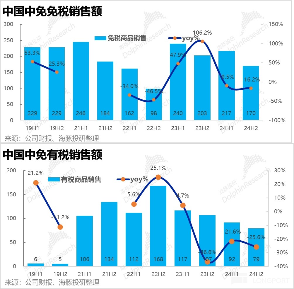 但有稅銷售到 2H24 仍佔據整體銷售額的近 32%,若一直無法止跌,集團整體營收也難以止跌回升。據公司披露,三亞和海口國際免稅城的有稅商業建築已結構封頂,隨著這些物業投入運營,有可能促進有稅銷售的止跌。