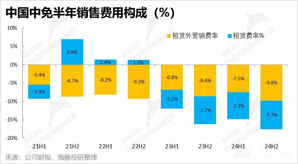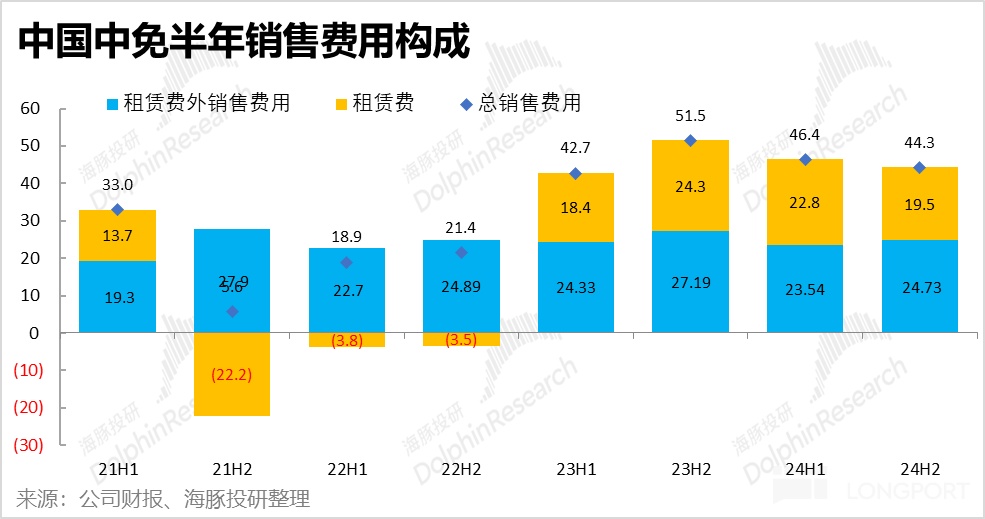 按半年度披露的銷售費用構成來看,盡管 2024 年機場渠道的營收是顯著修復了的,但主要支付給機場的租賃費用相比去年卻是略降的,從 94.2 億下降到 90.6 億。體現出中免與機場重新簽訂的給機場更低分成條款帶來的幫助。