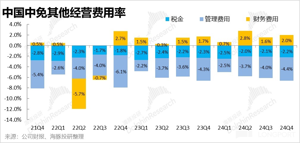 2、分收入類型,有稅收入的同比降幅(-26%)依然明顯高於免稅銷售收入(-16%),是導致公司整體銷售跌幅遲遲沒有好轉的主要原因。雖然我們本就認為,有稅銷售屬於疫情期間的 「救火性」 角色,隨著核心免稅業務的修復會自然淡出。但有稅銷售在 2H24 畢竟仍佔據整體銷售額的近 32%,若一直無法止跌,集團整體營收也難以止跌。
