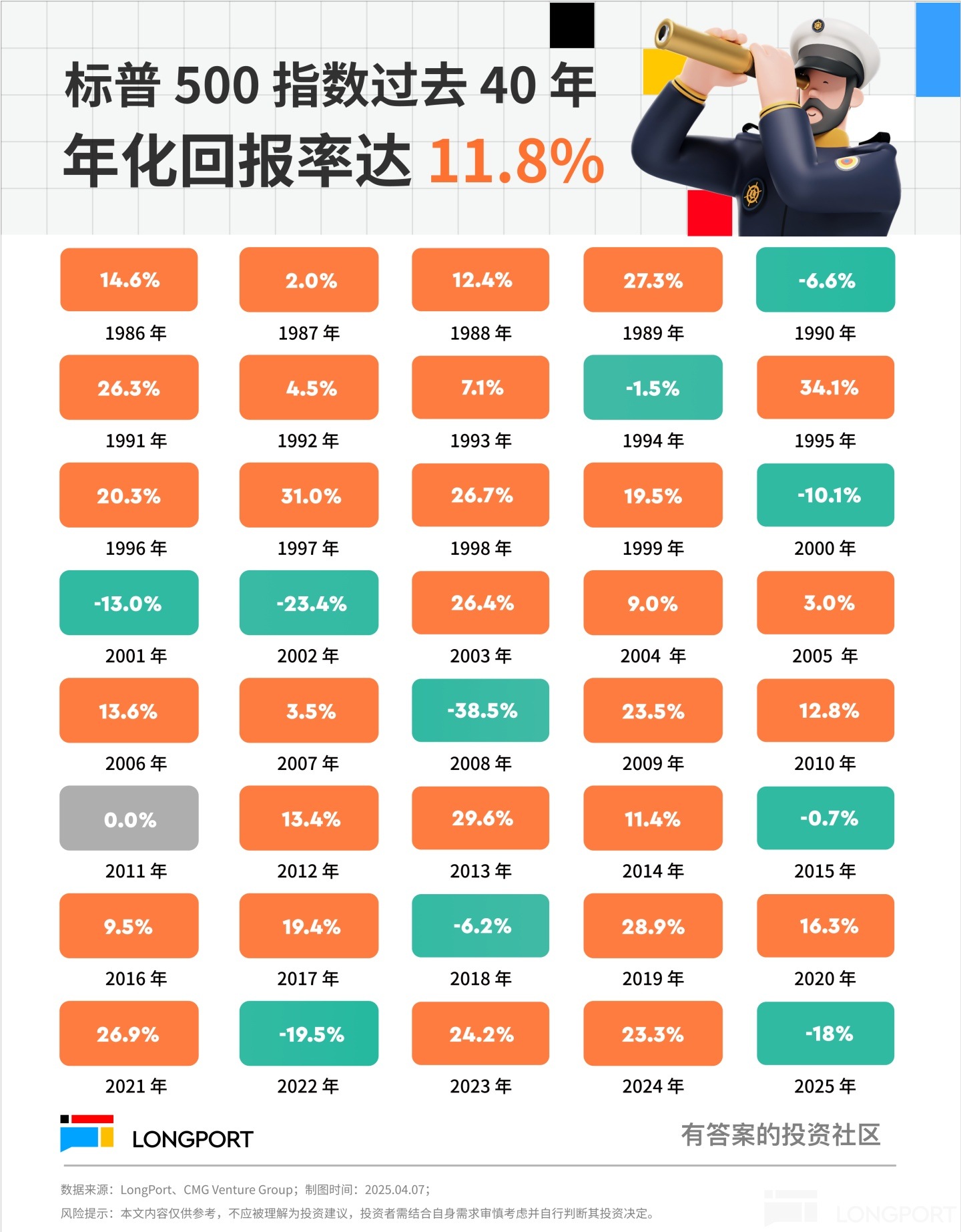 根據 CMG Venture Group,過去 40 年標普 500 指數年化回報率達 11.8%,如果投資者能夠抓住長期的底部區域買入或定投,年化回報率可能更高。