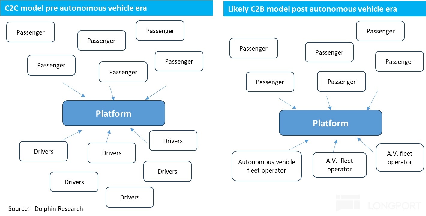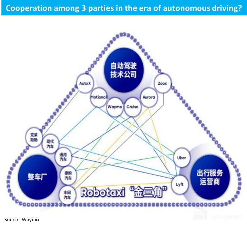 以上分析,我們都從將網約車行業視作一個整體的角度。但隨著自動駕駛技術的普及,勢必引入更多的行業參與者(包括且不限於自動駕駛技術的提供方,無人網約車的運營方等),給當前已相對穩定的競爭格局帶來明顯的改變。
