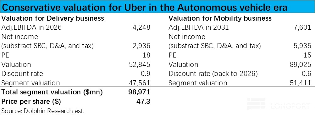 最終的估值上,① 首先外賣業務我們仍按照當前26年的盈利預期估值,基於26年的adj.EBITDA扣除股權激勵、攤銷折舊、和稅費後的測算淨利潤,給26e 18x PE。且雖然市場目前並不認為自動駕駛會直接影響外賣業務。但我們考慮到網約車帶動效應的減弱,按90%計算最終估值。