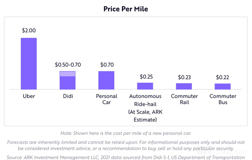 而隨著自動駕駛的普及,網約車在比公共交通便捷的同時,也有希望在使用成本上與公共交通的成本接近。根據ARK的測算,自動駕駛技術成熟且運營規模化後,無人駕駛網約車的運營成本可以壓縮到約$0.25每英裡(我們自己測算後能夠得到相近的數字,但需要注意這個數字只考慮了成本,還沒考慮運營方的利潤空間),與地鐵和公交車平均每英裡價格$0.22~$0.23的價格已近乎沒有差距。