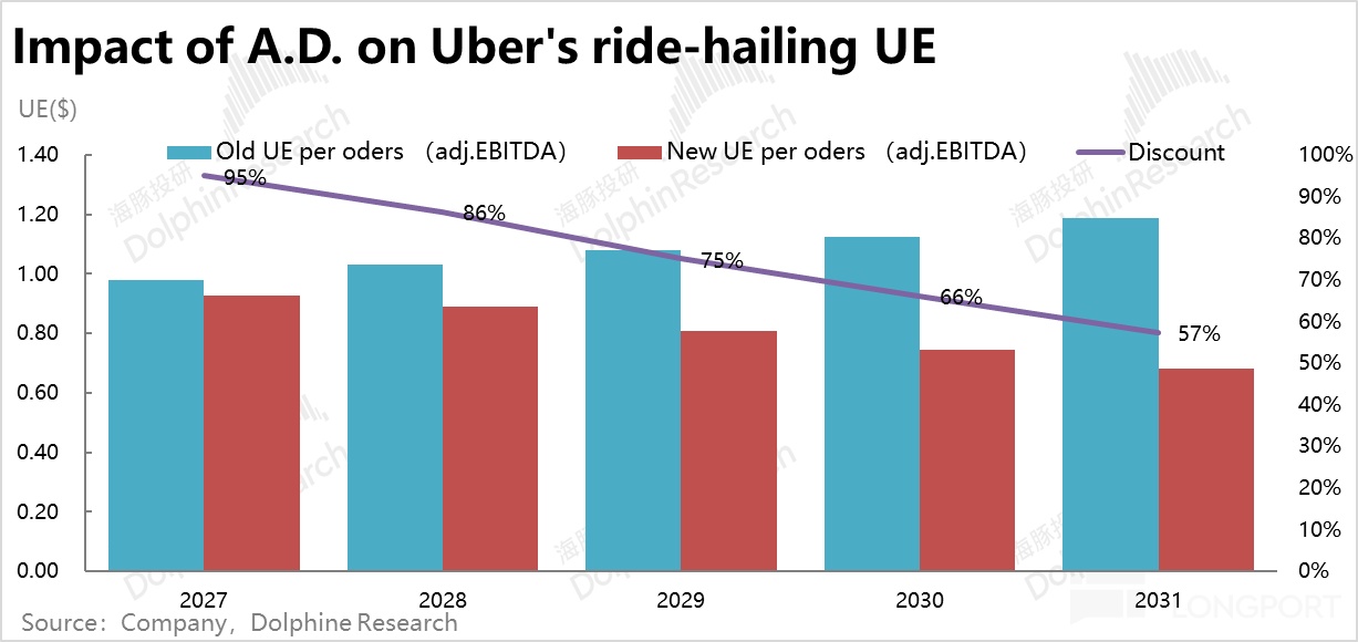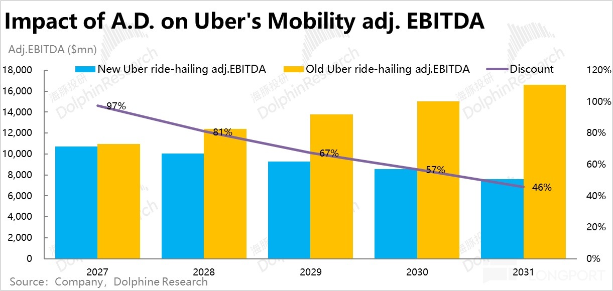 將上述影響計入後,Uber到2031年的調整後EBITDA就僅為原預測值的約46%。