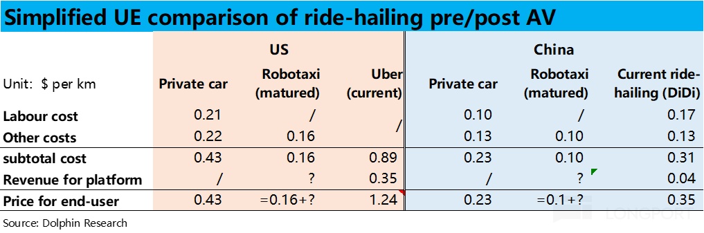 ② 中國市場:根據海豚投研的測算(也參考了其他機構),在技術完全成熟的情況下,國内網約車的運營成本可以低至每公裡0.7~0.8元,約$0.1。背後的關鍵假設包括,普通Robotaxi的成本下降到約15萬元,不再需要任何安全員, 保險、維修等運維成本每車每年約2萬(每日55元)。
