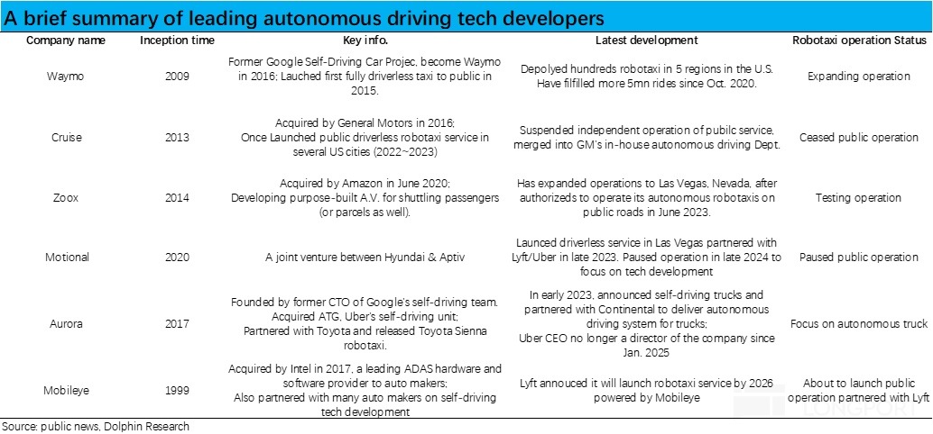 首先從自動駕駛開發者獨立運營網約車平台的角度,當前獨立開發自動駕駛技術的企業雖然相當眾多(國内主要是各家車企自研,而海外則是第三方的獨角獸機構為主),但其中相當一部分的發展裡程並不順利,當前能夠向公眾提供無人駕駛網約車服務的寥寥無幾。