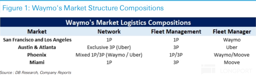 ① 平台端和車隊端全部Waymo自行管理的純1P模式;② 平台獲客和車隊管理全部由Uber負責的純3P模式(Waymo僅提供自動駕駛技術和車輛);③ 車隊由Waymo管理,但可同時從自營平台和Uber平台獲客的1P/3P混合模式;④ 由Waymo自營平台獲客,但交由第三方Moove管理車隊。類似於模式①的輕資産化。