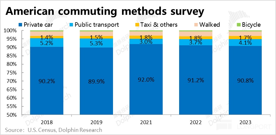 ① 通過侵蝕公共交通份額,取得的增量市場空間:根據前文的數據,美國的上班通勤情景下,公共交通的使用比重大約在4%上下。考慮到公共交通在其他場景下的使用率應當更低一些,假設全場景公共交通的使用比重約3%(4%的70%~80%左右)。