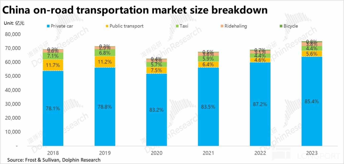 2、自動駕駛技術對出行市場的影響,應當更多反映在乘車出行結構的變化上(各種途徑的佔比)。首先從歷史數據來看,中國乘車出行各渠道(按金額)的佔比在2018~23年間的變化趨勢上,中國私家車出行比重最高且在持續上升(近期已達約85%);公共交通的比重持續下降(從近12%到約5%);網約車+出租車的整體比重大約穩定在7%~10%之間,趨勢上兩者内部網約車在侵蝕出租車的份額。