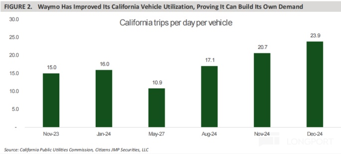 據加州官方數據,到24年底Waymo在加州區的無人駕駛汽車平均每輛每天的訂單數量已接近24次。簡單假設每單花費時間為30分鐘(可能偏短了),在加上約20%~30%的空閑等待時間,意味著加州的無人駕駛網約車目前的「有效」運營時間已達15小時/每天。再結合新聞報道中,長時間工作的人力司機一天的單數也不過25~30左右。由此可見,在加州投放的無人駕駛網約車的使用率相當高,當地居民對無人網約車的需求可以說是比較旺盛的(至少在當前的運力供給下是如此)。