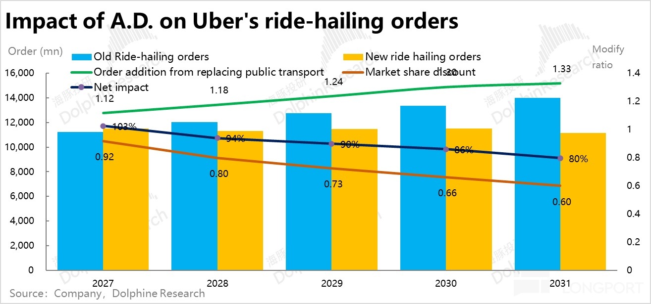 綜合上述兩點的影響,我們測算出在自動駕駛的影響下,2031年Uber的網約車訂單量會是原先預測的80%。