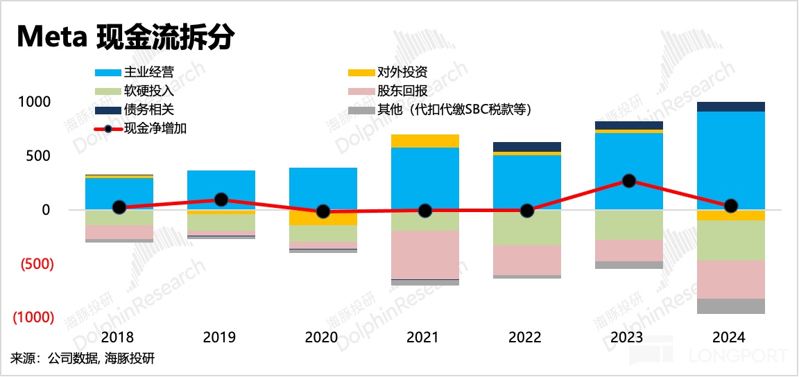 Meta整體資金配置思路是收支同步,即在經營面不錯的時候,資金支出也會同比例擴張,最終控制淨現金變動在很小的區間範圍。除了2023年淨現金增加異常,主要是偶發性開源節流的效果(美國經濟前低後高+中國跨境電商/遊戲公司的廣告增量,同時在股東的要求下減少對VR的投入)。