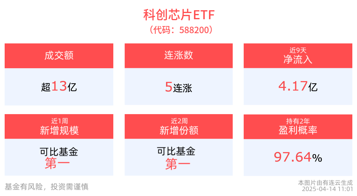 流動性方面,科創芯片ETF盤中換手5.83%,成交13.91億元。規模方面,科創芯片ETF近1周規模增長22.97億元,實現顯著增長。份額方面,科創芯片ETF近2周份額增長2.58億份,實現顯著增長。