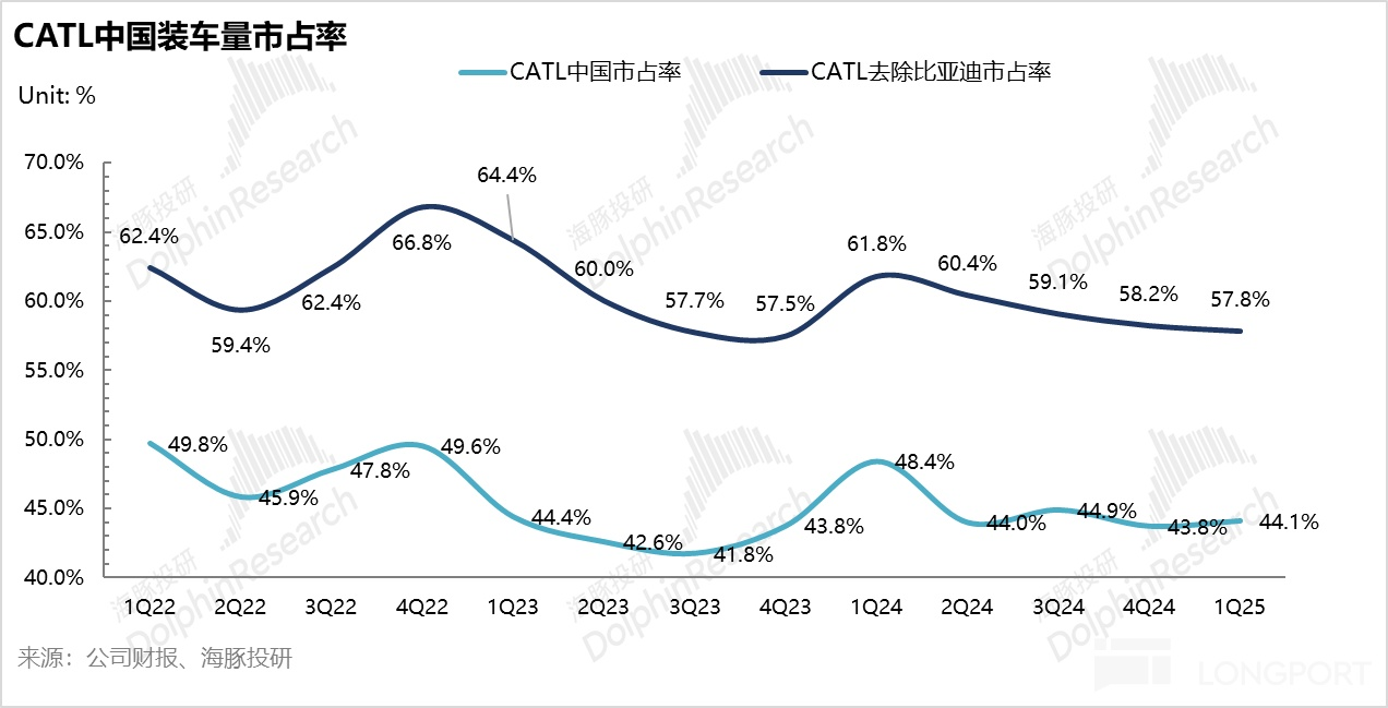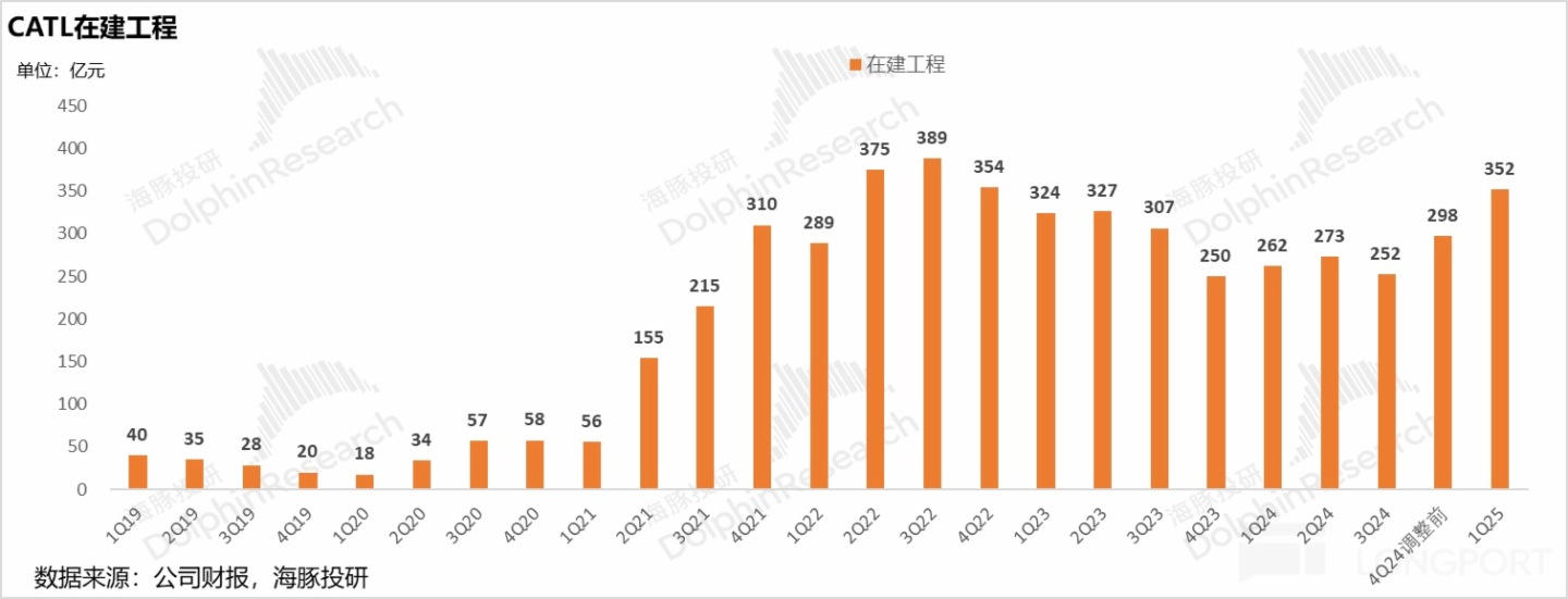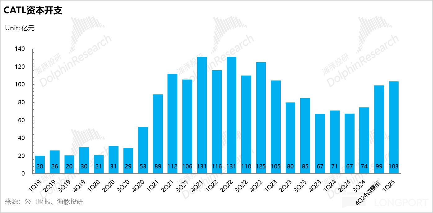 但自 2024 年三季度開始,寧王就開始增加了資本支出,到 2025 年一季度達到了階段性新高 103 億元,同時從寧王的在建工程來看,寧王的在建工程環比上季度還要增加 54 億元至本季度 352 億元,海豚君認為在建産能增加可能為 2025 年的新品周期增加以及換電站的建設在做準備,今年動力電池神行電池和麒麟電池會集中出貨,從去年佔比 3-4 成,到今年佔比 6-7 成,而增混電池骁曉去年年底發佈,已配套了 30 多款車型,2025 年搭載骁曉的車型也會在 2025 年集中上市。