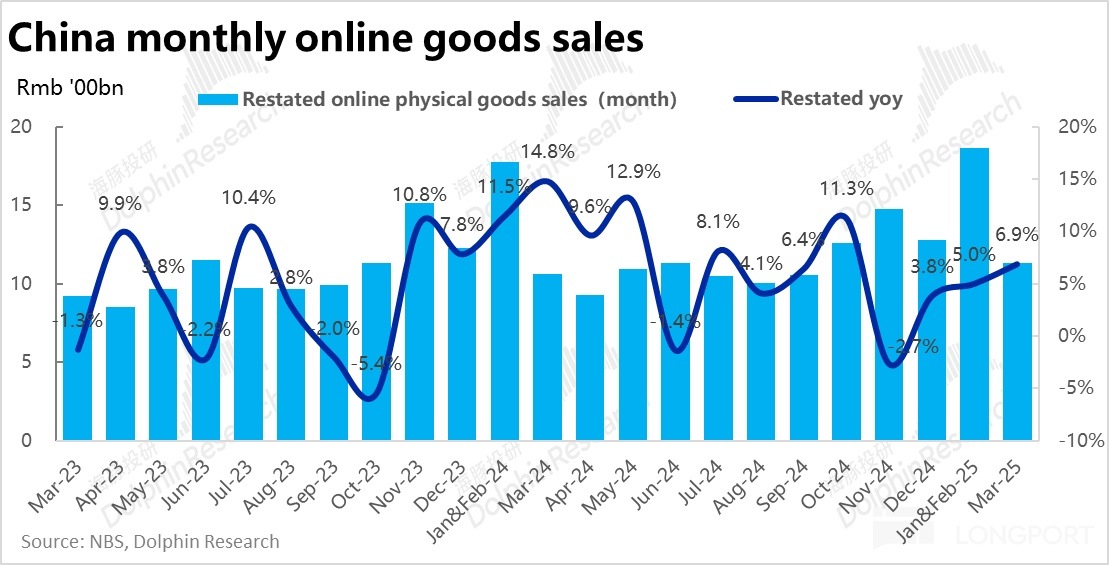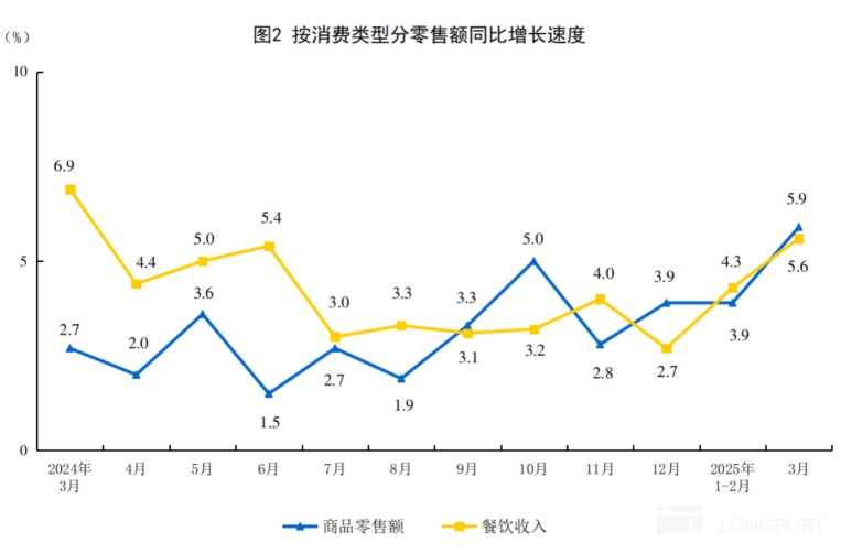 按統計局披露數據,整體社會零售額在 3 月份同比增長了 5.9%(按歷史數據計算增速為 4.9%),延續了春節以來消費增速邊際回暖的趨勢,增速環比再提速 1.9pct。相比 24 年一整年有 9 個月的社零同比增速都在 2%~4% 之間,25 年可謂開了一個好頭。