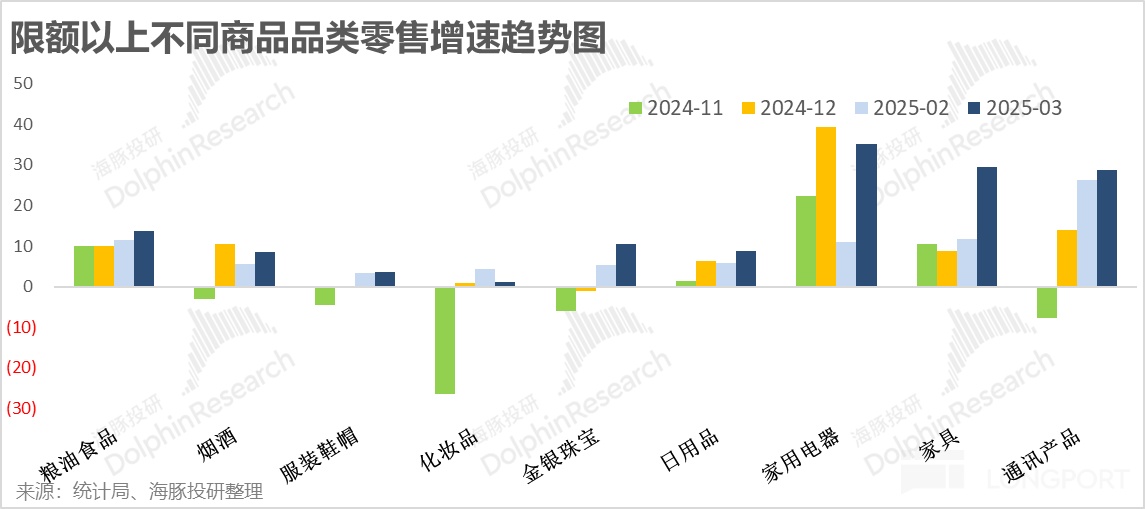 而由於年初國補的範圍擴大到了平板和手機的品類,3 月份家電、家具、手機、體育娛樂産品,等電子或家庭耐用品,等增長依舊跨越式的領先,同比增速普遍達 20% 以上。1~2 月受春節假期和需求前置影響下,增速曾明顯回落的家電、家具品類,3 月份增速又重新擡頭。國補的利好作用仍相當顯著、並未明顯退坡,而在上述利好板塊上具有優勢的零售渠道或品牌方,一季度的業績大概率會不錯。