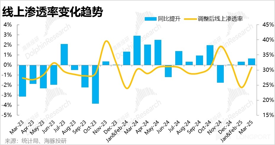 跟隨消費整體的回暖趨勢,綫上實物零售(經調整後)3 月同比增長了 6.9%,同樣較1~2 月環比提速了 1.9pct。此外,綫上滲透率(即綫上零售佔整體大盤的比重)同樣呈現緩慢改善的迹象。3 月綫上滲透率同比提升了 0.6pct,近 3 個發佈周期内同比提升幅度一直在走高。雖然綫上滲透率同比提升的絕對值並不高,但仍然展現出綫上渠道 「有限」 的相對優勢。