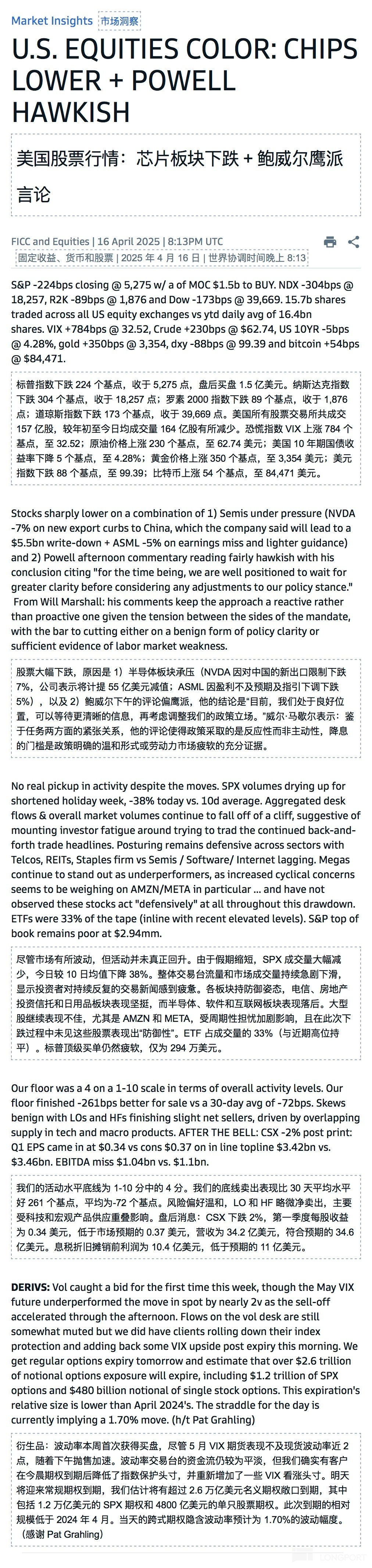 標普指數下跌 224 個基點,收於 5,275 點,盤後買盤 1.5 億美元。納斯達克指數下跌 304 個基點,收於 18,257 點;羅素 2000 指數下跌 89 個基點,收於 1,876 點;道瓊斯指數下跌 173 個基點,收於 39,669 點。美國所有股票交易所共成交 157 億股,較年初至今日均成交量 164 億股有所減少。恐慌指數 VIX 上漲 784 個基點,至 32.52。
