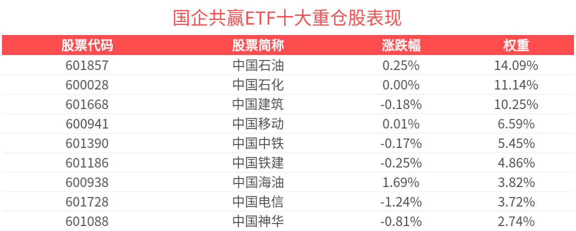 國企共贏ETF(159719)緊密跟蹤富時中國國企開放共贏指數,指數由100只成分股構成,包括80個A股公司和20個在香港上市的中國公司。該指數前十大成分股均為「中字頭」股票,包括中國石油、中國石化、中國建築、中國移動(A、H股)、中國鐵建、中國海油、中國中鐵、中國海洋石油、中國神華。