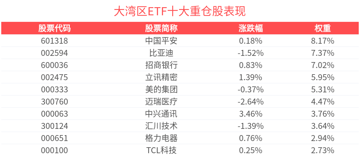 大灣區ETF(512970)緊密跟蹤中證粵港澳大灣區發展主題指數。數據顯示,截至2025年3月31日,中證粵港澳大灣區發展主題指數(931000)前十大權重股分別為比亞迪(002594)、中國平安(601318)、招商銀行(600036)、立訊精密(002475)、美的集團(000333)、匯川技術(300124)、邁瑞醫療(300760)、中興通訊(000063)、格力電器(000651)、TCL科技(000100),前十大權重股合計佔比53.49%。
