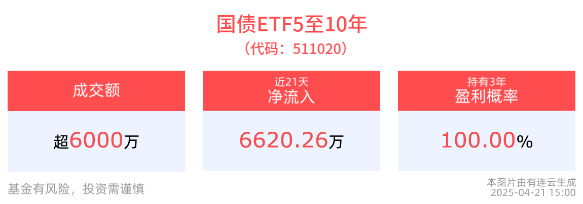 流動性方面,國債ETF5至10年盤中換手4.64%,成交6635.45萬元。拉長時間看,截至4月21日,國債ETF5至10年近1年日均成交3.05億元。