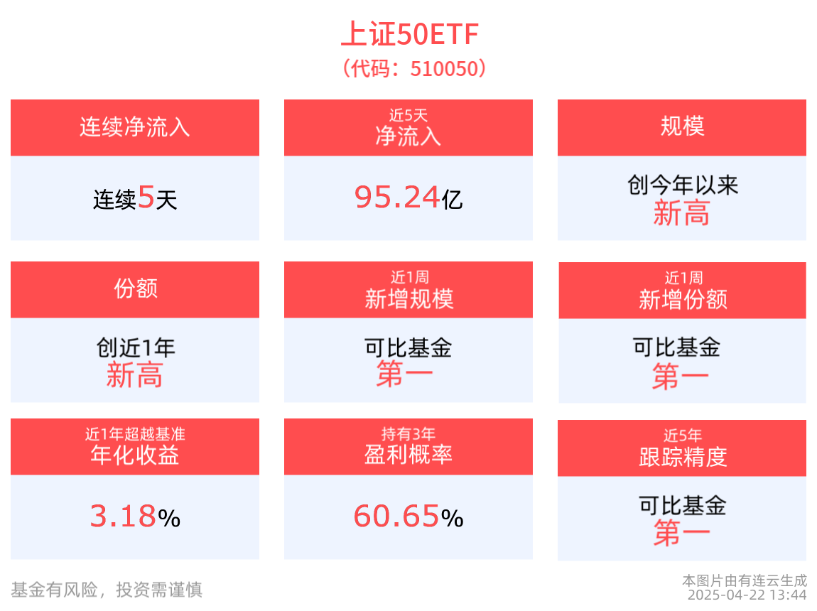 從資金淨流入方面來看,上證50ETF近5天獲得連續資金淨流入,合計「吸金」95.24億元。截至4月21日,最新份額610.82億份,最新規模達1657.03億元,均創今年以來新高。