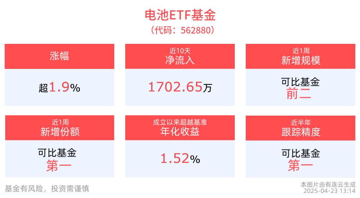 截至2025年4月23日 13:14,中證電池主題指數強勢上漲2.18%,成分股富臨精工上漲10.19%,派能科技上漲7.58%,銀輪股份上漲5.92%,科達利、陽光電源等個股跟漲。電池ETF基金(562880)上漲1.96%。
