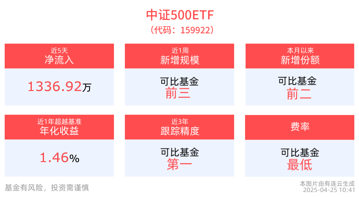 流動性方面,中證500ETF盤中成交6687.80萬元。規模方面,中證500ETF近1周規模增長6569.38萬元,實現顯著增長。份額方面,中證500ETF本月以來份額增長1.75億份,實現顯著增長。資金流入方面,中證500ETF最新資金淨流入448.20萬元。拉長時間看,近5個交易日内有3日資金淨流入,合計「吸金」1336.92萬元。