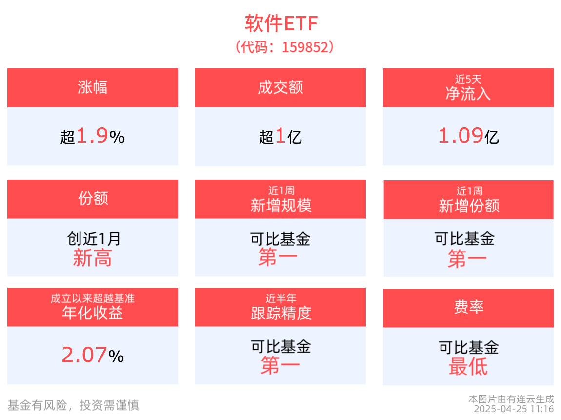 流動性方面,軟件ETF盤中換手5.76%,成交1.61億元。規模方面,軟件ETF近1周規模增長1.01億元,實現顯著增長。份額方面,軟件ETF最新份額達36.79億份,創近1月新高。資金流入方面,軟件ETF最新資金淨流入2681.24萬元。拉長時間看,近5個交易日内,合計「吸金」1.09億元。