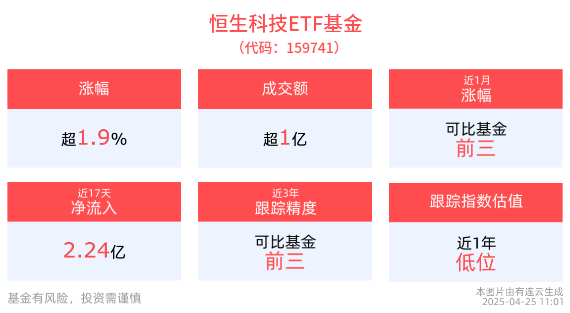 截至2025年4月25日 11:01,恒生科技指數強勢上漲1.44%,成分股地平綫機器人-W上漲5.89%,蔚來-SW上漲5.41%,聯想集團上漲4.91%,百度集團-SW、哔哩哔哩-W等個股跟漲。恒生科技ETF基金(159741)上漲1.93%。