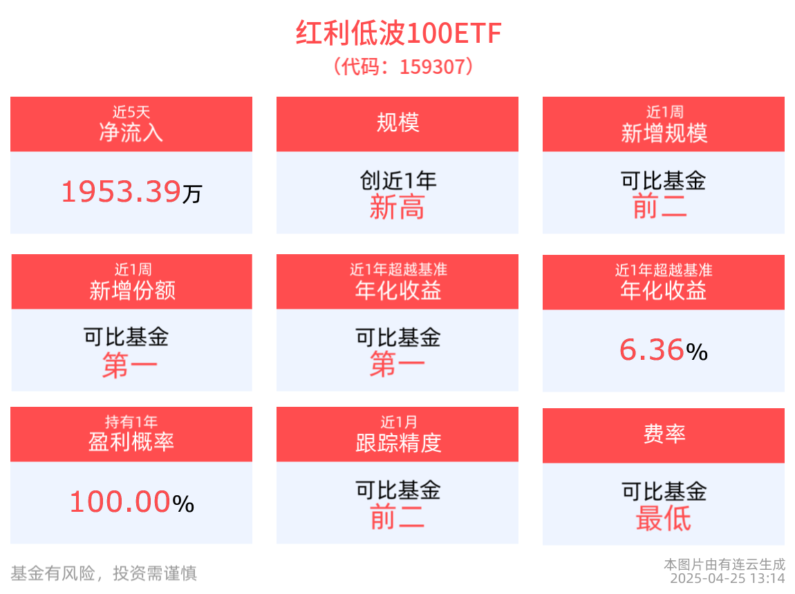 截至4月24日,紅利低波100ETF近1年淨值上漲8.98%,排名可比基金第一。從收益能力看,截至2025年4月24日,紅利低波100ETF自成立以來,最高單月回報為15.11%,最長連漲月數為2個月,最長連漲漲幅為5.84%,漲跌月數比為6/5,上漲月份平均收益率為4.09%,歷史持有1年盈利概率為100.00%。截至2025年4月24日,紅利低波100ETF近1年超越基準年化收益為6.36%,排名可比基金1/4。