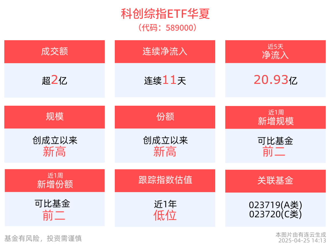 從資金淨流入方面來看,科創綜指ETF華夏近11天獲得連續資金淨流入,最高單日獲得13.61億元淨流入,合計「吸金」22.97億元,日均淨流入達2.09億元。