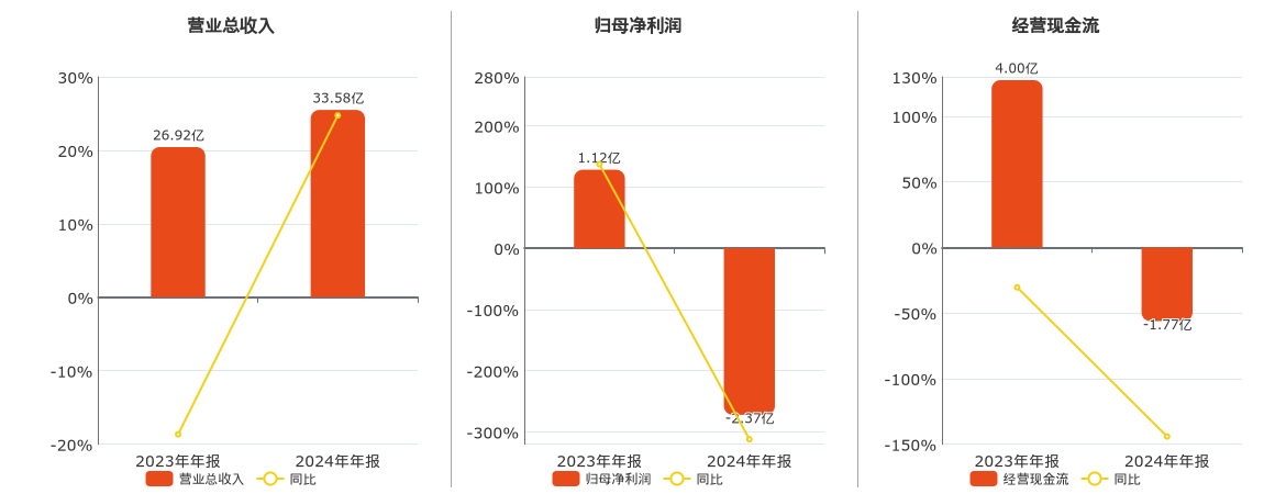 公司營業總收入為33.58億元。歸母淨利潤為-2.37億元,在已披露的同業公司中排名第11,較去年同報告期歸母淨利潤減少3.48億元,同比較去年同期下降312.04%。經營活動現金淨流入為-1.77億元,在已披露的同業公司中排名第13,較去年同報告期經營活動現金淨流入減少5.77億元,同比較去年同期下降144.10%。