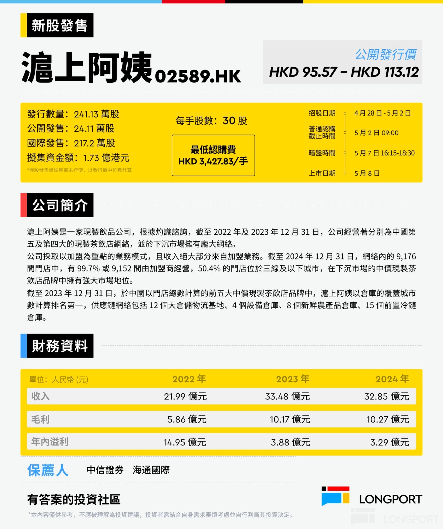 $滬上阿姨(02589.HK) 於 4 月 28 日啓動港股 IPO,計劃發行 241.134 萬股 H 股,香港公開發售佔 10%,國際配售佔 90%,定價區間為每股 95.57 至 113.12 港元,預計 5 月 8 日上市。此次募資將用於數字化升級、産品研發及供應鏈強化,並計劃擴展至更多三綫及以下城市。