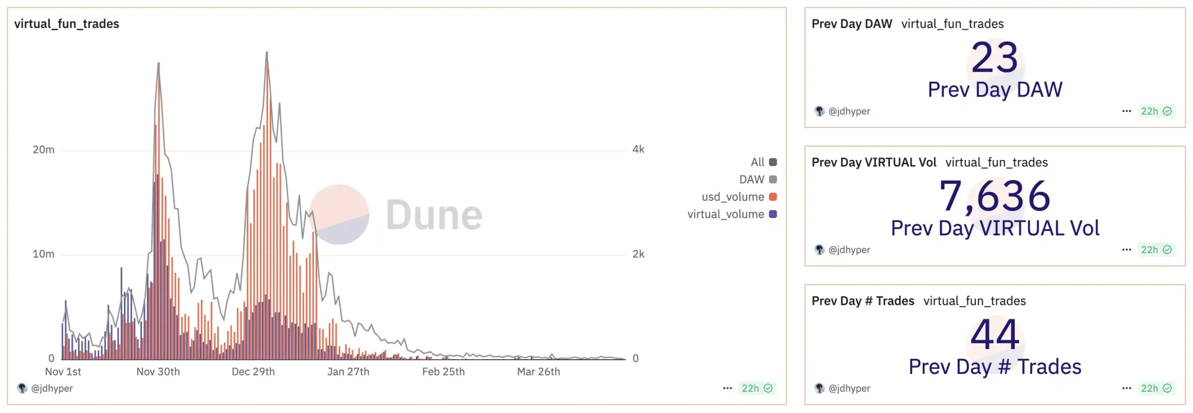 作為上個周期生態搭建與價值飛輪結合的最完善的 AI 項目之一,Virtuals Protocol 的幣價隨著市場的沉寂飛輪的旋轉速度也放緩了,隨之而來的是價值 45 億美元市值的泡沫被戳破,跌幅超過了 90%,而發射器的參與者也大幅降低。但 Virtuals 沒有放棄,在這個 AI 的熊市,他們開始 Build,而如今 Virtuals 的市值已經回到了 10 億美元的關口。