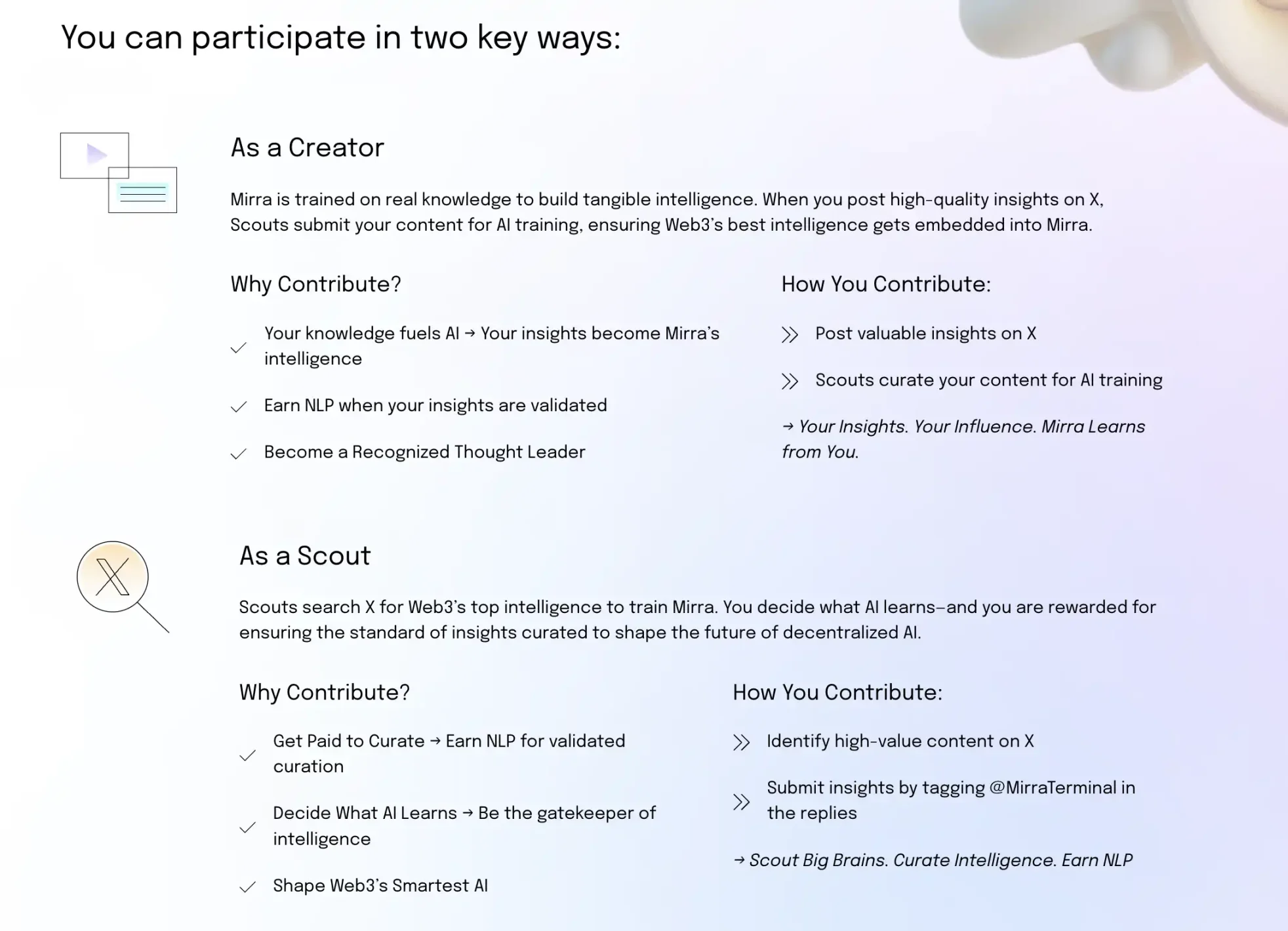Mirra 是一個基於精選數據進行訓練的去中心化 AI 模型,目前 Mirra 分為兩種參與模式,用戶可以成為一個 Creator 内容創作者,僅僅需要在 X 上持續分享内容就行,這個模式邏輯類似與 Kaito,但更加自由更沒有目的性。第二種就是 Scout 偵察兵,在優質的内容下 Tag Mirra 來學習,如果這個值得學習則用戶能獲得 NLP。目前不清楚其盈利模式,可能有多種可採用的模式,其中一個就是接入其他需要市場情緒或判斷力的工具中,如 DEFAI 等。