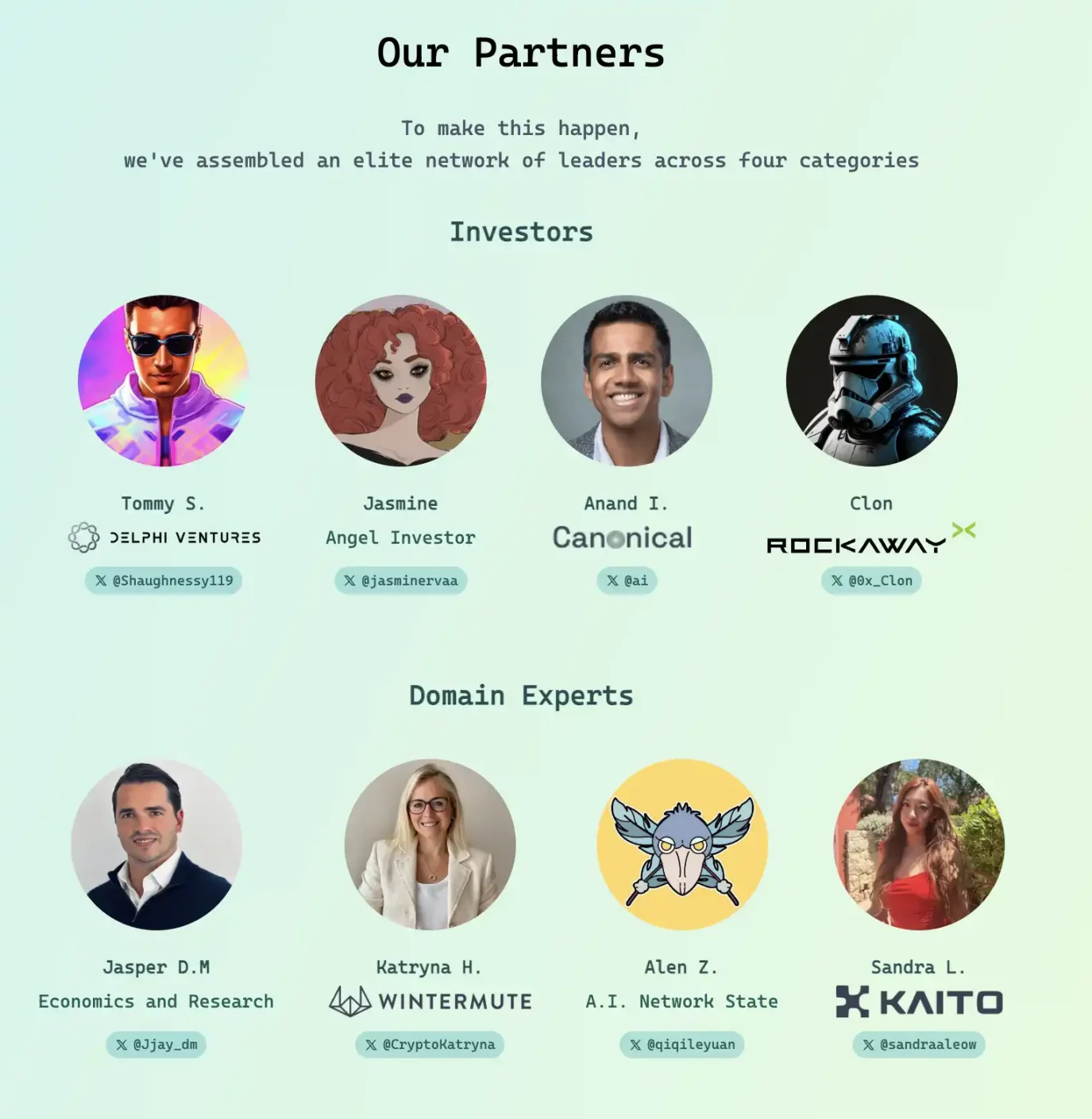 首先,Virtuals 完善了自己的項目方建設生態,發佈了 VPN 計劃「Virtuals Partners Network」,從一開始 Virtuals 的計劃就是將更多的 AI 人從引入 Crypto,而該計劃將多個生態位置相連接,包括投資人、各個領域專家、學者和開發者,幾乎是只要你有一個想法,從投資人到做市商、市場營銷甚至專業人才都可以從這個計劃中獲取資源。「一條龍服務式」的孵化器,可以說對任何想要進入 Crypto 的人才跟 Virtuals 合作是最佳選擇。