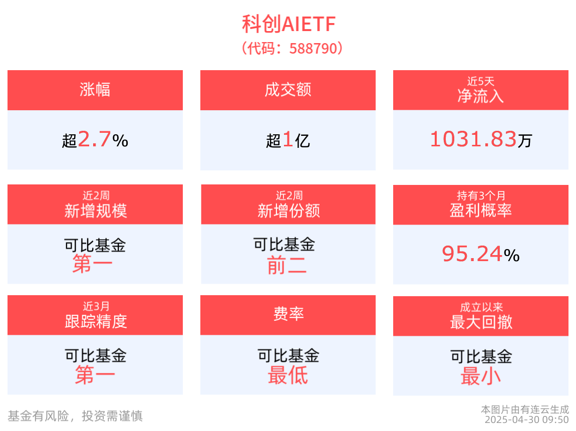 跟蹤精度方面,截至2025年4月29日,科創AIETF近3月跟蹤誤差為0.016%,在可比基金中跟蹤精度最高。