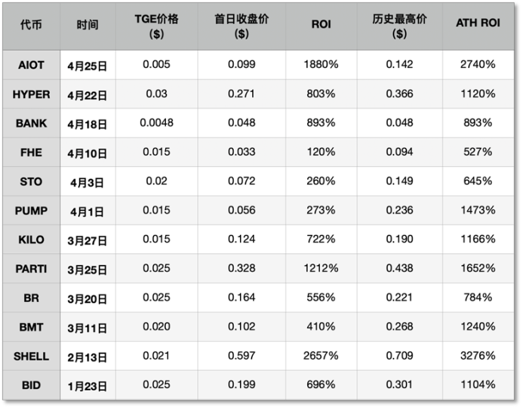2 月 13 日,AI 消費層項目 MyShell(SHELL)的 TGE 活動在 Binance Wallet 上綫,原本計劃「募集價值 80 萬美元 BNB,發行 4000 萬枚 SHELL」的活動,湧入了 4.8 萬多名用戶,致使 SHELL 一度超募 42 倍。有用戶僅用 0.06BNB(時值 16 美元)就獲得了 826.98 SHELL,短期獲得淨收益達 562 美元。Cryptorank 數據顯示,截至 4 月 29 日 8 時,SHELL 報價 0.21 美元,其 TGE ROI 為 1082%,ATH ROI 則達 3451%。