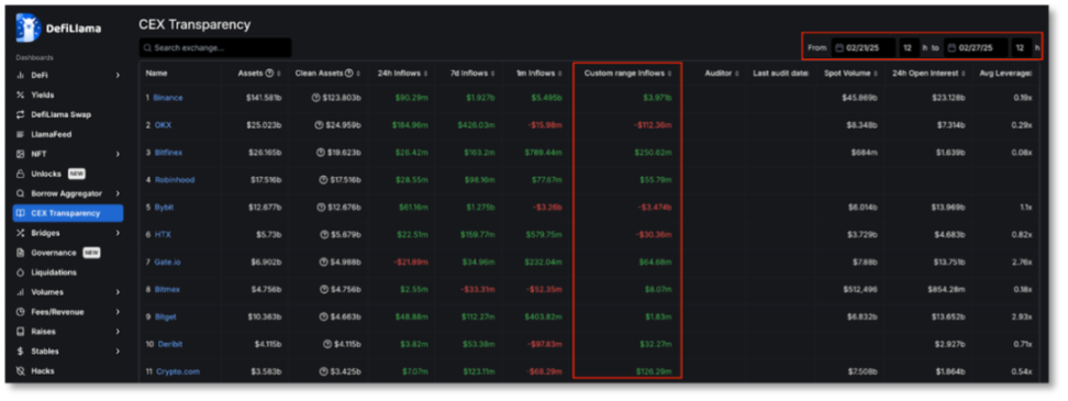 此外,今年 2 月,Bitget 遭遇黑客攻擊,14 億美元資金被盜。根據 DefiLlama 的數據,在事件發生後的一周内,即 2 月 21 日至 27 日,Binance 的淨流入量達 39.7 億美元。相比之下,這比同期其他九家主要交易所(不包括遭受攻擊的平台)的總和高出十倍。
