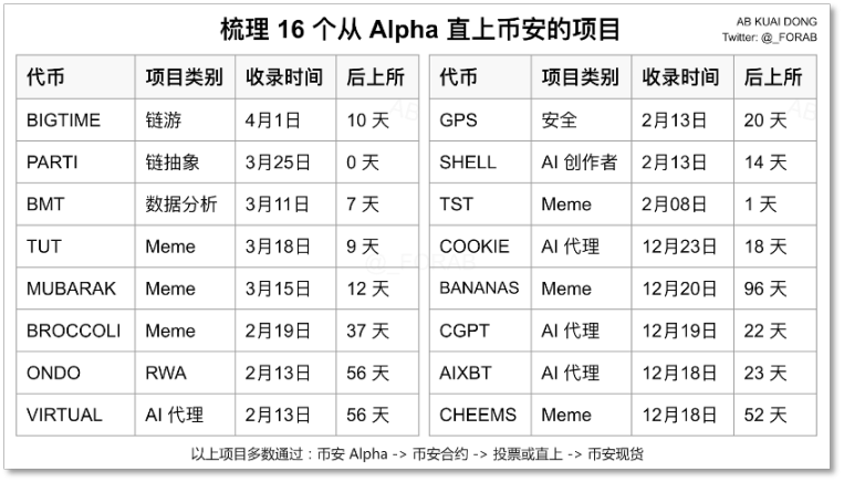 今年年初,Binance 就在力推 Alpha 板塊,起初以 Alpha 代幣有機會上主站為噱頭,側重推出這個原本在 Web3 錢包内的交易板塊。目前,已經有 16 個從 Alpha 交易區登陸 Binance 主站(現貨市場或合約市場)的新代幣。一定程度上,新代幣在 Alpha 交易區的表現成為 Binance 現貨上新的觀察區,它們在 Alpha 的交易量代表著社區認可度,很有可能會被用戶以投票的方式推上主站。