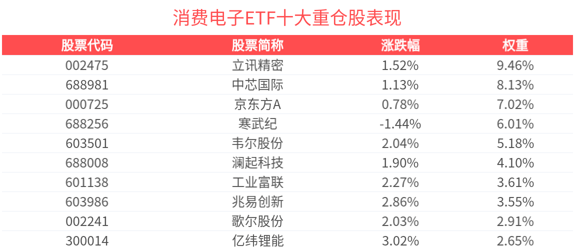 數據顯示,截至2025年3月31日,中證消費電子主題指數(931494)前十大權重股分別為立訊精密(002475)、中芯國際(688981)、京東方A(000725)、寒武紀(688256)、韋爾股份(603501)、瀾起科技(688008)、工業富聯(601138)、兆易創新(603986)、歌爾股份(002241)、億緯鋰能(300014),前十大權重股合計佔比53.05%。
