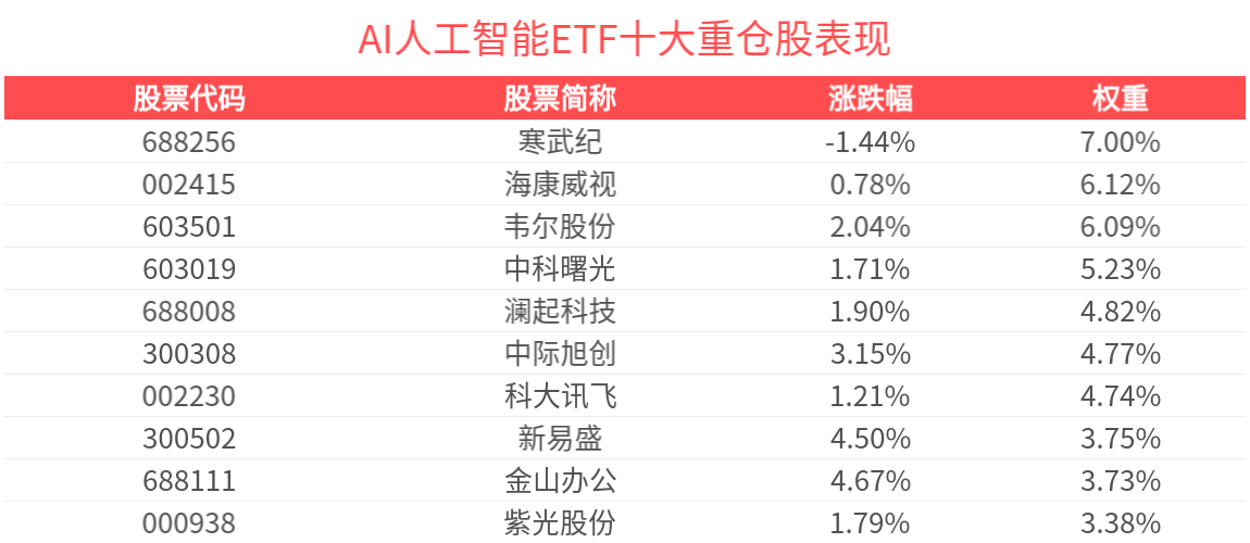 數據顯示,截至2025年3月31日,中證人工智能主題指數(930713)前十大權重股分別為寒武紀(688256)、海康威視(002415)、韋爾股份(603501)、中科曙光(603019)、瀾起科技(688008)、中際旭創(300308)、科大訊飛(002230)、新易盛(300502)、金山辦公(688111)、紫光股份(000938),前十大權重股合計佔比49.82%。