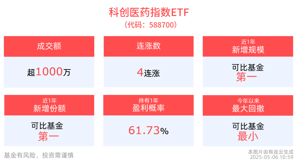 截至2025年5月6日 10:59,上證科創板生物醫藥指數上漲0.33%,成分股智翔金泰上漲4.71%,華恒生物上漲4.13%,百利天恒上漲4.08%,南微醫學上漲3.98%,澳華内鏡上漲3.91%。科創醫藥指數ETF(588700)沖擊4連漲。